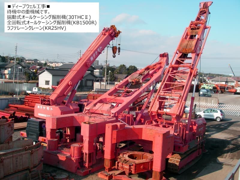 | 保有機械 | 全回転式オールケーシング掘削機(KB1500R) 揺動式オールケーシング掘削機(30THC) テレスコピッククローラクレーン(TK550GSB) テレスコピッククローラクレーン(SDX207) ラフテレーンクレーン(KR25HV) クローラ型パーカッションドリル(RPD130C) クローラ型パーカッションドリル(RPD160C) 全回転式チュービング装置(RT-120SL) 揺動式チュービング装置(自社モデル) クレーン付トラック バキュームポンプ ヒューガルポンプ バキューム・ヒューガル一体型ポンプ ウォータジェット用消防ポンプ ウェルポイント・ヘッダパイプ・付属器具 ディープウェル用揚排水管・各種バルブ ノッチタンク(2m3~20m3) 高圧グラウトポンプ 超低騒音型ディーゼル発電機 |